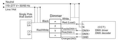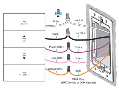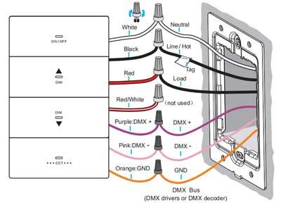 Este 100-277 V CA Regulador de intensidad DMX Combina el control de iluminación profesional DMX512 con la comodidad, la tranquilidad y la estética de la iluminación doméstica. Diseñado con el tamaño y el estilo de un interruptor doméstico, se integra a la perfección con cualquier decoración.