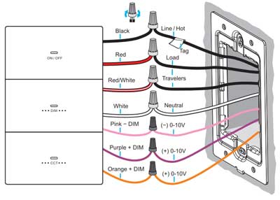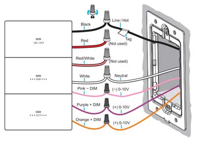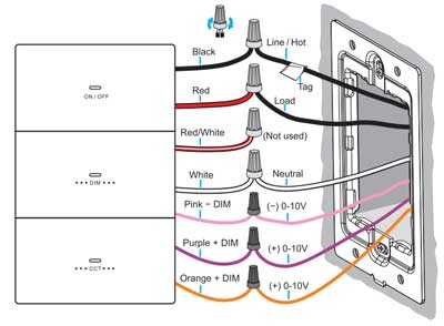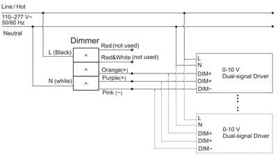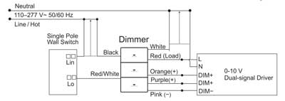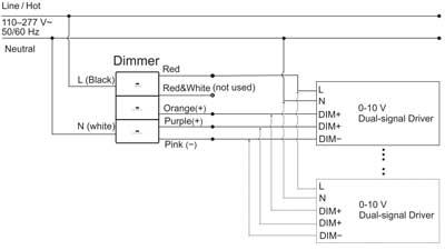 Nota: Conecte el cable vivo de entrada de CA (L) del balasto/controlador de 0-10 V al cable de carga del atenuador (rojo).