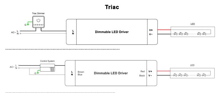 1. El nivel de corriente constante de salida se puede ajustar a través del terminal de entrada de la línea de fase de CA (L) mediante la conexión de un regulador Triac.