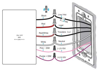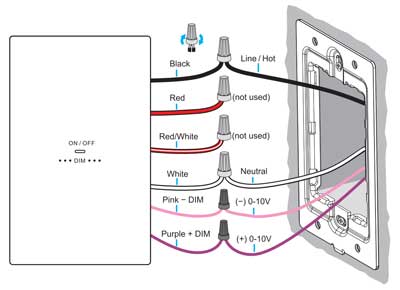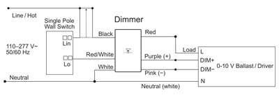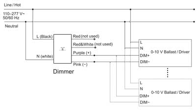 Nota: Conecte el cable de entrada de CA activo (L) del balasto/controlador de 0-10 V al cable de carga del atenuador (rojo).