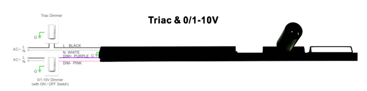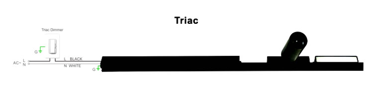 La modulación de ancho de pulso (PWM) del voltaje de salida se puede ajustar a través del terminal de entrada de la línea de fase de CA (L) mediante la conexión de un atenuador de fase/Triac o un sistema de iluminación.